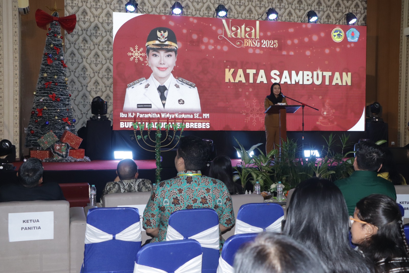 Bupati Brebes Hj Paramitha Widya Kusuma SE MM dalam sambutannya menyampaikan ucapan selamat Natal dan Tahun Baru 2026 kepada seluruh umat Kristiani. Ia menegaskan, perayaan tersebut bukan sekadar rutinitas ibadah, melainkan penguat nilai-nilai toleransi di Brebes.