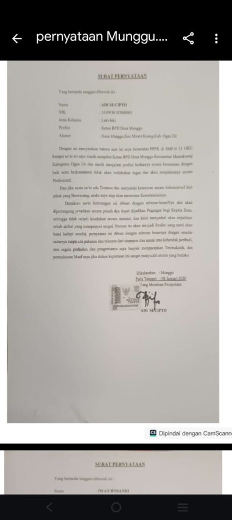 OGAN ILIR – Polemik rangkap jabatan kembali mencuat di Kabupaten Ogan Ilir. Adi Sucipto, Ketua Badan Permusyawaratan Desa (BPD) Munggu, Kecamatan Muara Kuang, secara terang-terangan menolak mundur dari jabatannya meskipun telah resmi berstatus sebagai Pegawai Pemerintah dengan Perjanjian Kerja (PPPK) di Kabupaten OKU.(24/1/2026).