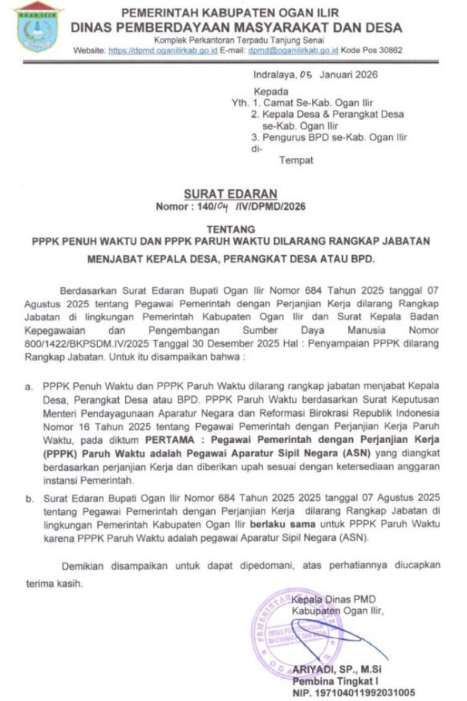 OGAN ILIR – Polemik rangkap jabatan kembali mencuat di Kabupaten Ogan Ilir. Adi Sucipto, Ketua Badan Permusyawaratan Desa (BPD) Munggu, Kecamatan Muara Kuang, secara terang-terangan menolak mundur dari jabatannya meskipun telah resmi berstatus sebagai Pegawai Pemerintah dengan Perjanjian Kerja (PPPK) di Kabupaten OKU.(24/1/2026).