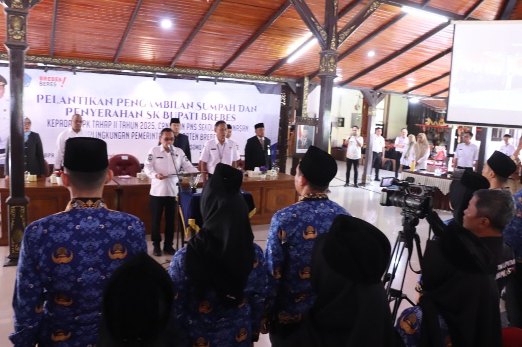 Pelantikan dan penyerahan SK berlangsung khidmat, dipimpin oleh Penjabat (Pj) Sekretaris Daerah Brebes Dr Tahroni MPd di Pendopo Brebes, Rabu (1/10/2025).