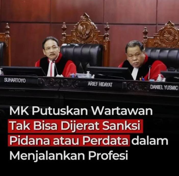 “Wartawan dalam menjalankan tugas jurnalistiknya dilindungi oleh Undang-Undang Pers. Oleh karena itu, setiap keberatan terhadap produk jurnalistik tidak serta-merta dapat diproses melalui jalur pidana atau perdata,” demikian salah satu pertimbangan MK dalam putusannya.